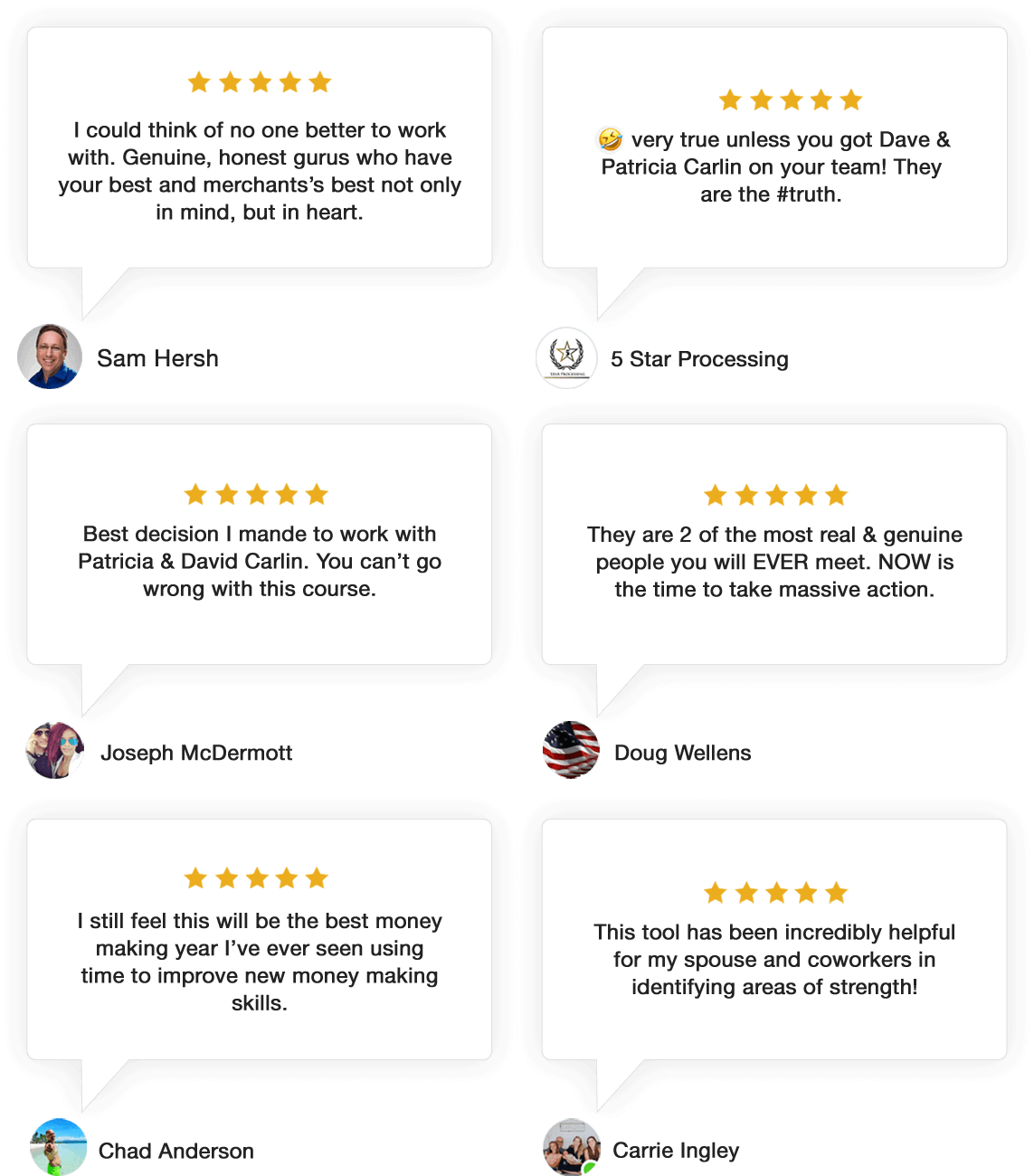 This is the only course you will ever need to become a massively successful Digital Payments Expert. David And Patricia Carlin are the #1 power couple in the payment processing world. They’ve taken over 20 years of experience and distilled it down into the industry’s first step by step training system. These are the exact same strategies they personally use to generate millions of dollars in commissions.